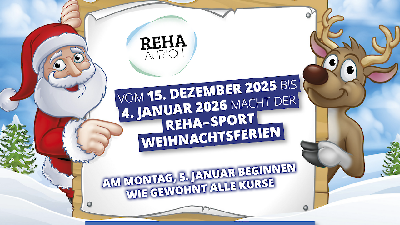 Vom 15.12.2025 bis einschließlich 04.01.2026 macht der Reha-Sport Weihnachtsferien. Am Montag, den 05. Januar 2026 starten alle Kurse wieder wie gewohnt.